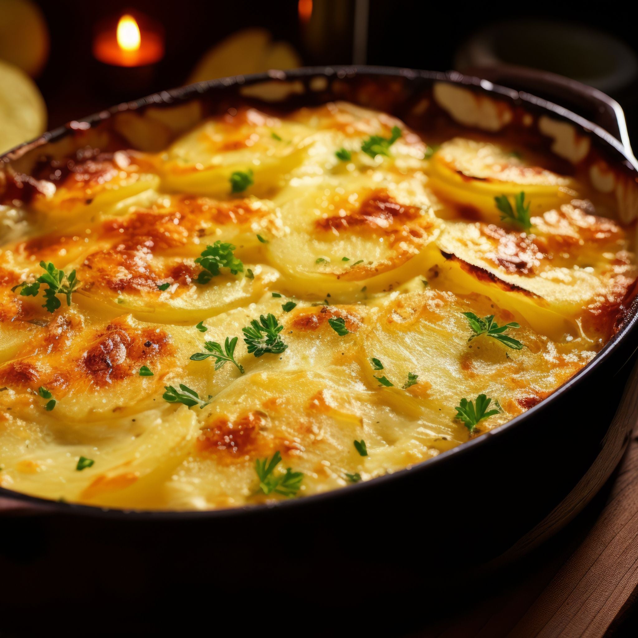 Tender sliced potatoes baked in a rich mixture of cream and milk, then topped with...