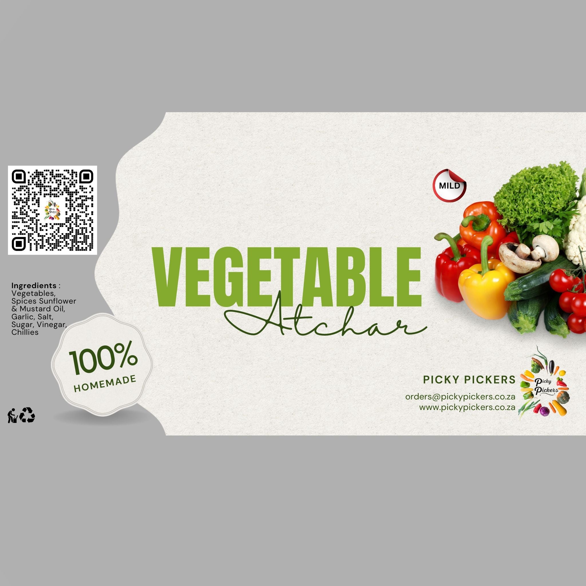 Vegetables, Spices Sunflower & Mustard Oil, Garlic, Salt, Sugar, Vinegar, Chillies